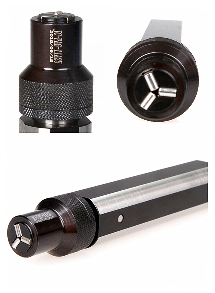 本工具壓力裝置設(shè)計(jì)在裝夾柄內(nèi)部,可極大的縮短滾壓頭伸出距離,較適合有行程限制的機(jī)床上平面滾壓加工。